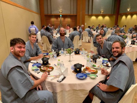Canadian team in Yukata. Yukata can be worn in Ryokan, a traditional Japanese style hotel.